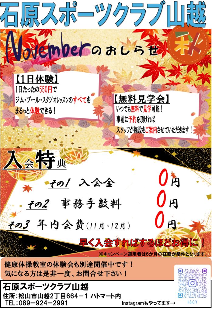 ☆11月フィットネスキャンペーン☆ / 未分類 / By ishihara-s-c-yamagoe-toukou 11月のフィットネスキャンペーンになります。 11月はなんと・・・ 入会時にかかる諸経費がすべて0円!! 早めに入会すればするほどお得に!! 悩んでいる方はひとまず見学・体験に起こしください。 皆様のご来店お待ちしております。
