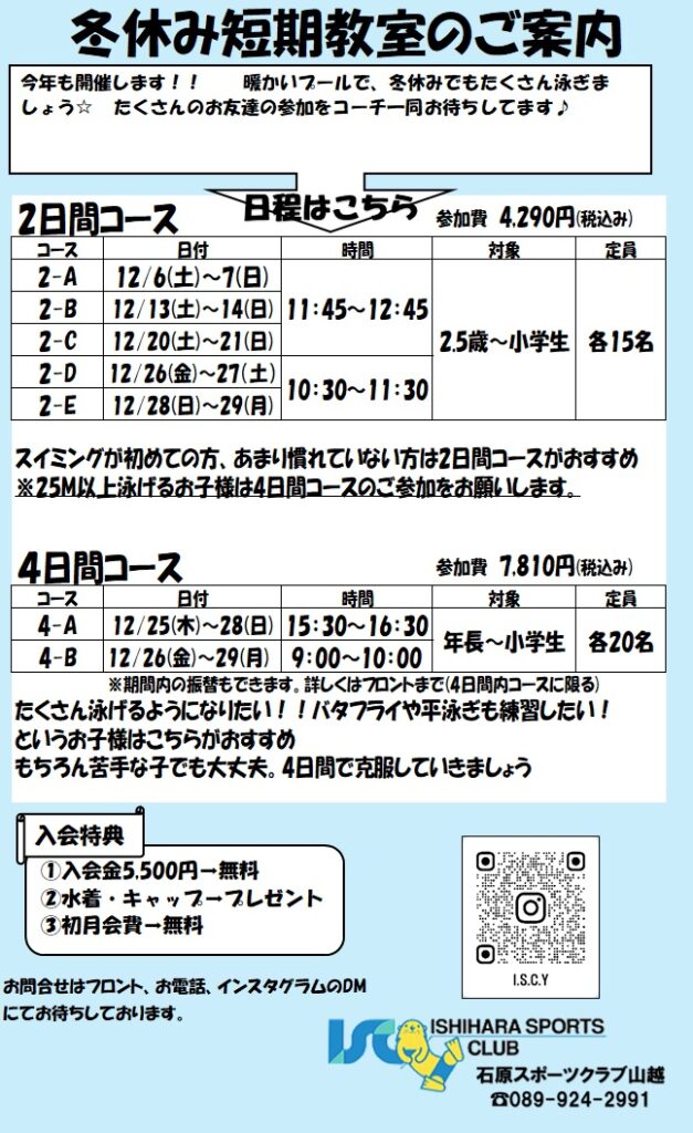 ☆冬休み短期教室のお知らせ☆ / 未分類 / By ishihara-s-c-yamagoe-toukou 今年も冬休み短期教室を開催します☆ 寒い冬も暖かいプールでたくさん泳ぎましょう!! 参加後のご入会で、嬉しい特典もございます。 皆様のご来店お待ちしております。