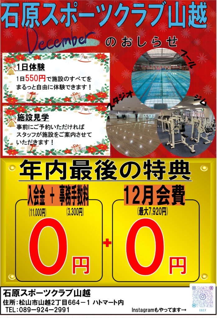 ☆12月フィットネスキャンペーン☆ / 未分類 / By ishihara-s-c-yamagoe-toukou 12月のフィットネスキャンペーンです。 12月は入会金・事務手数料・12月の会費が無料!! 早く入会すれば、するほどお得に!! 皆様のご来店お待ちしております。